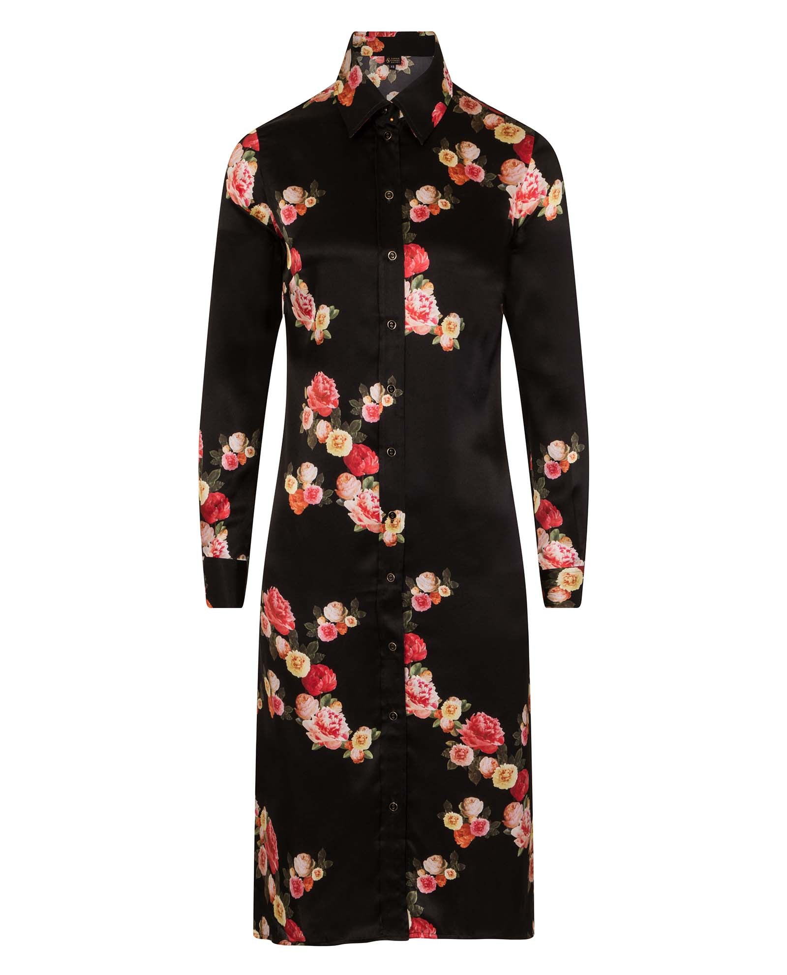 The Black Peony Silk Midi Dress, is a statement piece for effortless elegance. Cut from luxurious silk satin, this midi length silk dress is designed to provide a slim fit. Warm red, orange and yellow flowers nestle against a dark jet black satin in this bespoke floral print. The Black Peony Silk Midi Dress is the perfect choice for any elegant occasion, from formal dinner to wedding guest. Composition: 100% Silk Model wears a size XS Dry clean Cold hand wash Iron on a cool setting