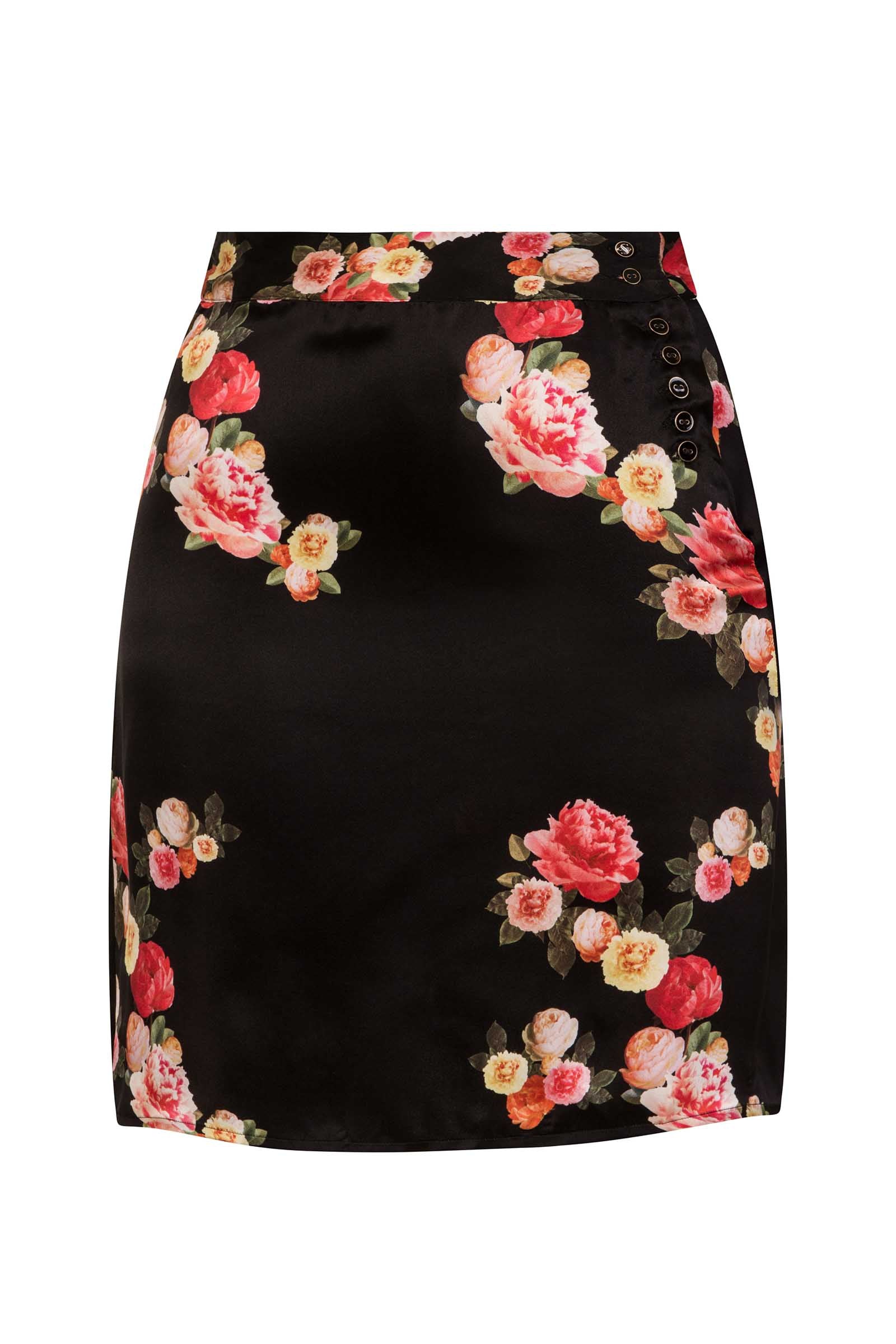 Meet MAE, this feminine silk mini skirt cut from a bespoke floral print silk satin, completes an array of looks. The Black Peony Silk Mini Skirt incorporates a delicate lace placement in the back vent. The warm floral print is made up of red, oranges and yellows on a jet black satin. This high-waisted silk skirt is tailored to perfection, fastening with custom-made, gold-edged buttons. Pair with the Silk Bow Blouse for a contemporary and elegant co-ord. Composition: 95% Silk, 5% Polyamide Model wears a size XS Dry clean Cold hand wash Iron on a cool setting
