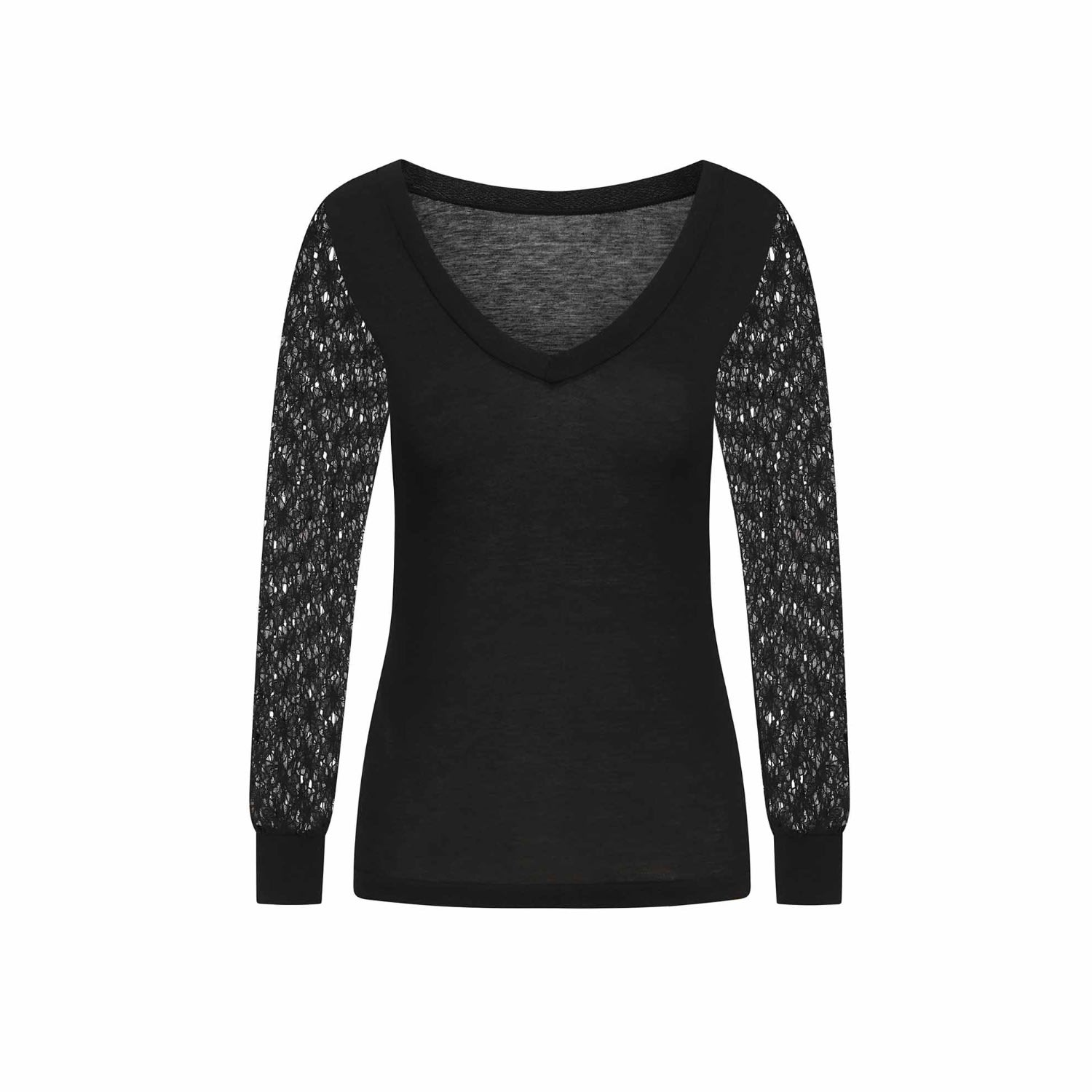 Made from a beautiful silky soft Lyocell and cotton jersey blend in black, this jersey top has a soft handle with a fitted design. Showcasing an open V-neckline and beautiful floral lace sleeve detailing and tailored cotton cuffs. Dress up or dress down this everyday top is the perfect wardrobe staple. Cotton jersey body, 70% Lyocell 30% Cotton