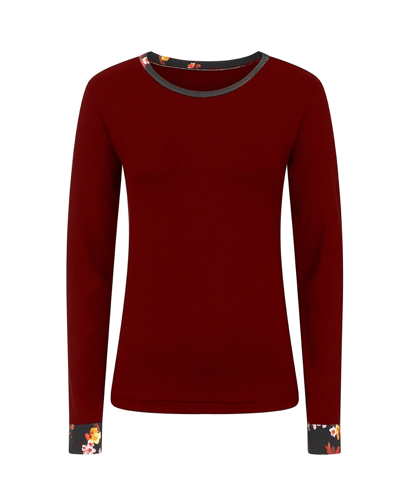 Introducing Anna, your new go-to for laid-back sophistication in the loose-fit Burgundy Cotton Long Sleeve Top. Crafted from irresistibly soft cotton jersey, this wardrobe must-have features long sleeves and a bespoke floral print delicately adorning the neckline and sleeve cuffs. Why fall in love with Anna? Boxy loose fit, embrace a relaxed silhouette that flatters any body shape. Adjustable sleeve length, the foldable sleeve cuffs offer versatility, allowing you to customize your sleeve length. Bespoke floral Print Detail is unique and exclusive on an everyday essential. Machine wash at 30 degrees Iron on a cotton setting Do not tumble dry