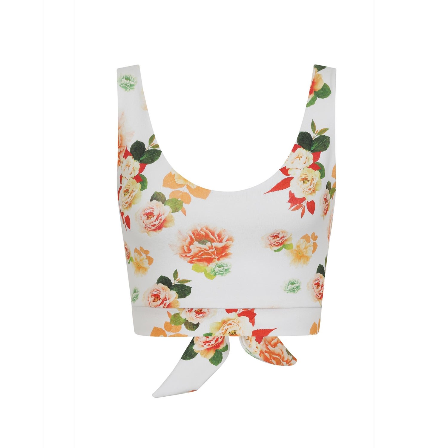 The White Floral Cotton Crop Top is made from a bespoke digital floral print jersey. Bright summertime green and orange hues sit on a white base. Fastened with a beautiful bow tie at the back for the ultimate versatility and elegant fit. The perfect co-ord with the cotton jersey leggings or pair with denim shorts. A favourite to be worn underneath any signature shirt from the collection. Machine wash on a delicate cycle Cool iron