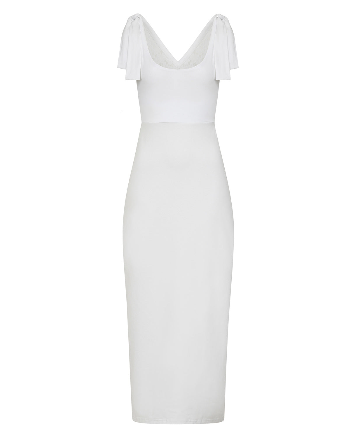 The ultimate summer dress perfect for hot holidays, garden parties or honeymoon. The White Lace Back Cotton Maxi Dress is cut from a mid-weight jersey with beautiful geometric lace back detailing. The self-tie shoulder straps are designed for a versatile and adaptable fit to suit your body shape. Mid-weight cotton jersey Adjustable self-tie straps for versatile fit Simply pulls on 80% Cotton 20% Rayon Made in the UK Machine wash on a delicate cycle Cool iron Do not tumble dry
