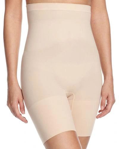 Spanx "Higher Power" lightweight short shaper. High-waisted design eliminates muffin top. Comfortable waistband that doesn't roll. Panels slim stomach, hips and thighs. Ruching detail at seat. Dig-free leg openings for a smooth look. Shaping level: firm control. Lined gusset. Nylon/spandex. Machine wash. Imported.