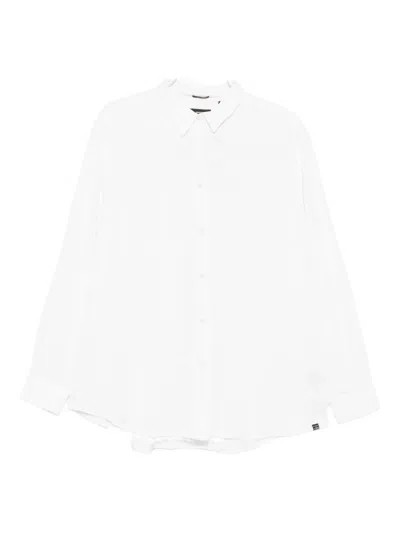 white button fastening long sleeves buttoned cuffs chest pocket curved hem
