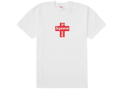 The white Supreme Cross Box Logo T-shirt was released by the brand as a part of their FW20 winter tees release, which took place on Week 17 of the season. Featuring two overlapped red box logos in a cross formation, this Supreme t-shirt is one of the most unique that the brand has ever released. The t-shirts were dropped in eight colorways, all of which featured the cross version of Supreme's popular Box Logo. This Supreme Cross Box Logo t-shirt was released on December 17th, 2020, at the retail price of $38 USD. | Men's Supreme Cross Box Logo Tee Shirt in White
