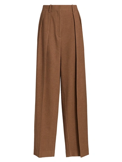 Pleated silk-blend trousers in a wide-leg silhouette. Banded waist Belt loops Zip fly and hook-and-eye closure Side seam pockets Lining: 100% cotton 51% silk/49% cashmere Dry clean Made in Italy SIZE & FIT Model measurements: 5'10" tall Model is wearing a US size 4. Designer Rtw - The Row > The Row > Saks Fifth Avenue > Barneys. The Row. Color: Brick. Size: 10.