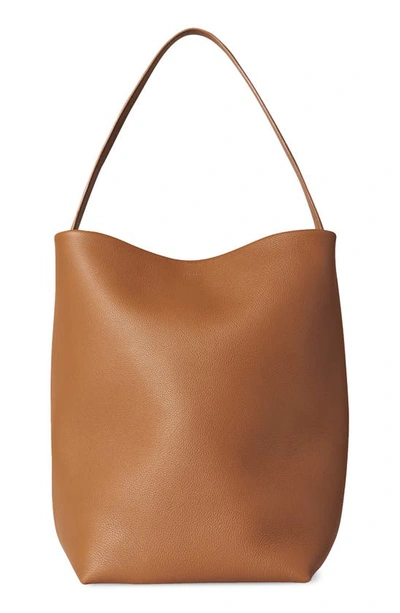 The Row N/S Park Leather Tote in Tan Grained leather with raw suede lining. Made in Italy. Measures approx 9W x 15H x 8D. Shoulder strap measures approx with a 21 in length with a 10.5 drop. Top tie closure. Metallic logo branding on front. TERX-WY2. W1273-L129. About the designer: The Row was established in 2006 by industry icons Ashley Olsen and Mary-Kate Olsen. Named in reverence of London's Savile Row, the fashion house emulates the bespoke standards of exceptional fabrics, impeccable details, and precise tailoring. The Row combines a timeless perspective with subtle attitudes which form an irreverent classic signature. The Row’s collections also explore the strength of simplistic shapes that speak to discretion and are based on uncompromising quality.