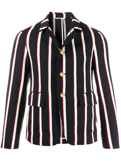 Don't get caught without your favourite jacket. And by that, we mean this grey button-up piece from Thom Browne. You won't regret it. Featuring a front button fastening, long sleeves, a striped pattern and side slit pockets.