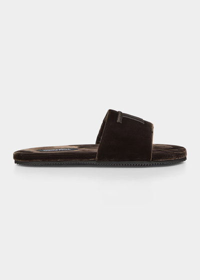 TOM FORD "Harrison" velvet slippers featuring embroidered TF logo Flat heel Open toe Single band vamp Easy slide style Rubber outsole Made in Italy