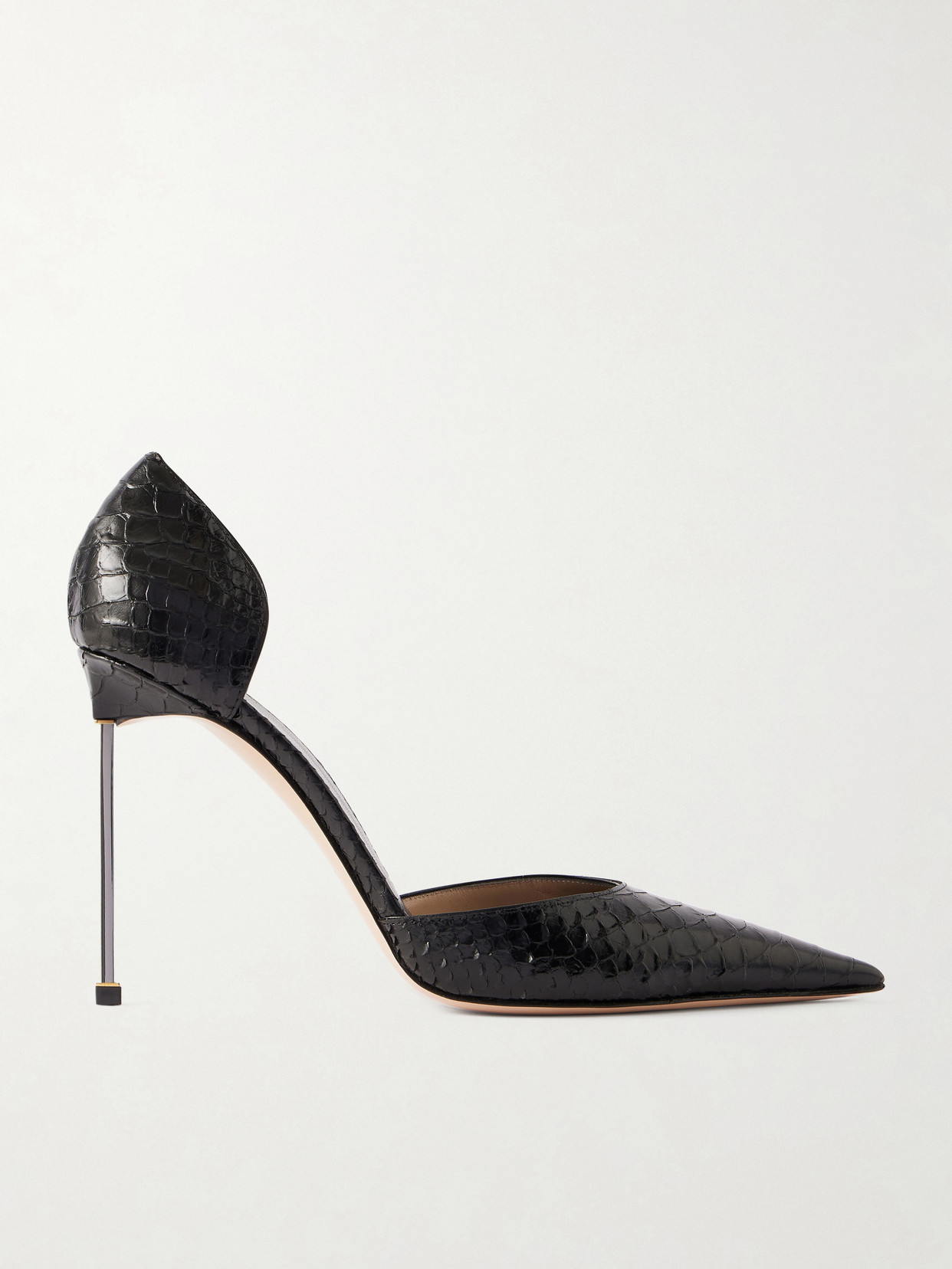 The Spire D orsay Pumps By Tom Ford Embody Architectural Elegance Through A Bold And Sculptural Silhouette. Crafted From Semi-shiny Printed Python Leather, They Feature A Sleek Pointed Toe And A Refined D orsay Cut That Enhances The Foot With Modern Sensuality. The Square Metal Stiletto Heel, Accented With Contrasting Galvanic Finishes, Adds A Striking Graphic Element, Reflecting The Brand s Unmistakable Aesthetic. Semi-shiny Printed Python Leather D orsay Design Pointed Toe Square Metal Stiletto Heel With Galvanic Accents Heel: 8,5 Cm Composition: Upper, 85% calf leather, 10% steel, 5% brass Lining, 100% goat leather Sole, 100% calf leather