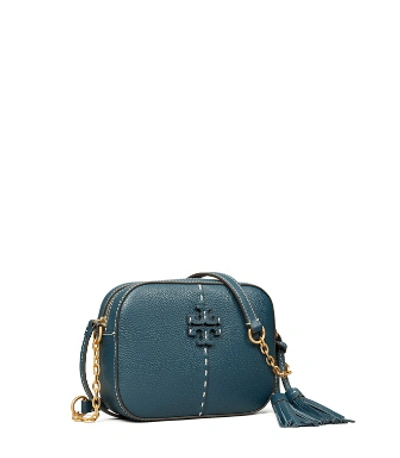 Directly from Tory Burch - A most-loved shape: The McGraw Camera Bag, softly structured in pebbled leather, features a die-cut double 'T,' vertical pick stitching, sewn by hand, and an adjustable chain-accented strap. Tory Burch Official Site.