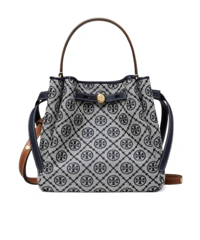 Signature logo jacquard and contrasting leather trims create textural interplay on a spacious bucket bag featuring an optional crossbody strap for convenient carry. 8 1/2" x 8 1/2" x 3 1/2" Magnetic-snap closure; adjustable drawstring with button closure Top carry handle; adjustable crossbody strap Interior wall pocket Flat base for stability Lined Textile with leather trim Imported