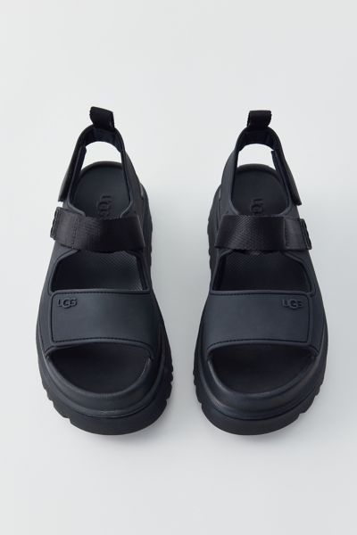 Ultra-comfy platform sandals from UGG. The UGG GoldenGlow sandals have a strappy upper and slingback heel. Features UGG GoldenGlow sandals Slingback platform sandals Lightweight and water friendly Platform lug sole Sugarcane EVA midsole Recycled polyester straps Adjustable hook & loop closure Content + Care TPU, sugarcane EVA, recycled polyester, rubber Spot clean Imported Size + Fit Platform: 2" Heel: 2" UGG GoldenGlow Sandal in Black, Women's at Urban Outfitters