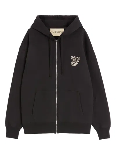 A black brushed cotton hoodie from Valentino Garavani features a unique VG patch on the chest. The design includes a front zip closure, long cuffed sleeves, and dropped shoulders, providing a relaxed fit along with practical front pockets. This piece captures the essence of streetwear sophistication while being crafted in Italy for a perfect blend of comfort and style.- Black brushed cotton material - VG patch on the chest - Front zip closure - Long cuffed sleeves - Dropped shoulders - Relaxed fit - Practical front pockets - Crafted in Italy