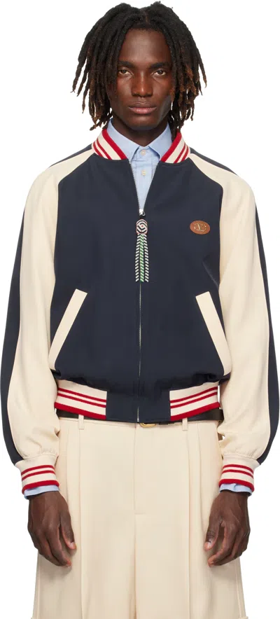 VALENTINO Wool And Cotton Bomber Jacket With Vlogo And Chat De La Maison Patch In Blue