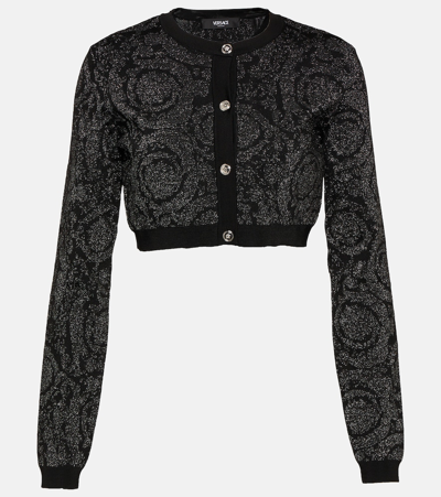 Black viscose blend cardigan from Versace fetauring fine knit, lurex detailing, signature Barocco pattern, signature Medusa Head buttons, crew neck, front button fastening, long sleeves, ribbed cuffs and cropped. Composition: _, 84% Viscose, 7% Polyamide, 6% Pm, 3% Elastane