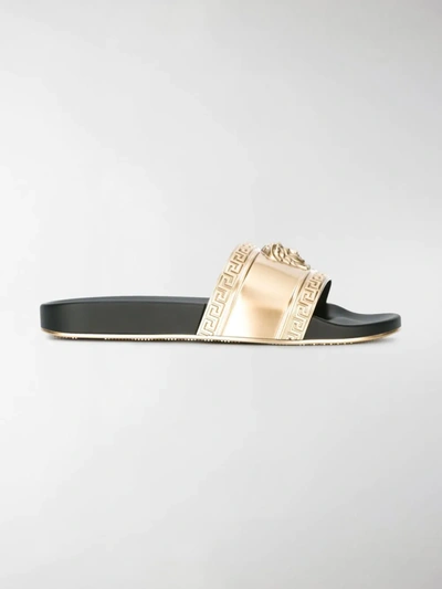 These Medusa head-embossed slides from Versace will make you feel just as stylish on the beach as when you're in the city - you can still look great in swim shorts you know. Set on comfy moulded footebeds, they're punctuated with the brand's Medusa head and key pattern. Versace Versace Versace. Featuring a molded footbed and an embossed logo.