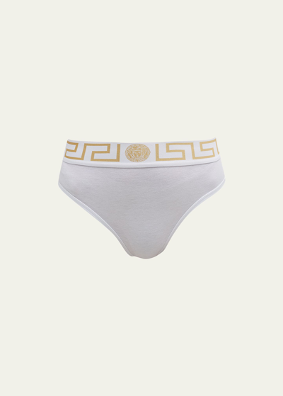 Versace stretch cotton briefs with iconic Medusa head and Greca border waistband. Elasticized waistband. High-cut legs. Moderate seat coverage. Cotton/spandex. Hand wash. Made in Italy.