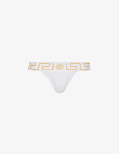 VERSACE Greca-border Mid-rise Stretch-cotton Jersey Thong In A1001 Optical White