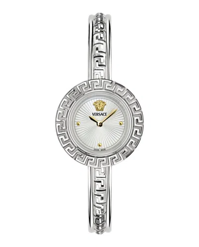A Medusa head and Greek-key patterning bring heritage style to a luxe watch further enhanced by a guilloche dial and matching bracelet. An additional two-tone leather strap lets you change up your mood for a more subtly stylish look. 28mm case; 12mm brand width Deployant clasp closure Swiss quartz movement Sapphire crystal face Guilloche dial Stainless steel/goldtone ionic plate/diamond Swiss made