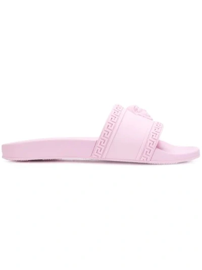 Introduce Donatella Versace's iconic Greek-inspired vision and indisputable luxury to your holiday styling with these Palazzo Medusa pool slides from the brand's SS18 collection. Crafted in Italy from durable and comfortable light pink rubber, these summer-ready sandals feature an open back, a slip-on style, an open toe, a moulded insole and a thick faux leather front strap with a signature Medusa head logo embellishment and Greek Key embossed details.