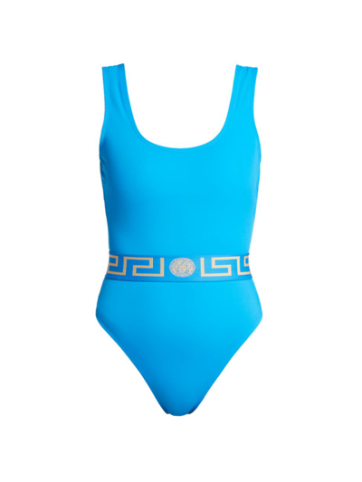 VERSACE Greca Band One Piece Swimsuit in Teal - Teal. Size 4 (also in 1, 2, 3, 5). VSAC-WX77. 1003204 A232185. About the designer: Since 1978, Gianni Versaces iconic Italian label has been celebrated for its over-the-top glamour and sexiness. After Gianni's tragic death in 1997, his sister Donatella took the creative reins, and while remaining consistent with Gianni's design aesthetic, Donatella has brought a bold femininity and subtle polish to the beloved design house.