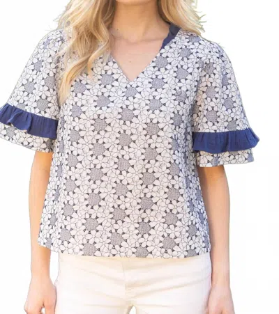 VOY Floral Embroidered Ruffle Accent Top In Navy In Multi
