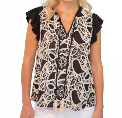 VOY Piasley Embroidered Front Self Tie Tassled Top In Black