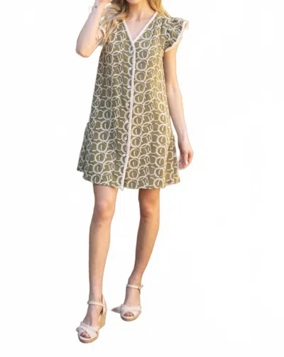 The perfect mini dress for those warmer months.Introducing the Trace Mini Dress by VOY, a stunning choice for your vacation wardrobe with its eye-catching olive and ivory pattern. This women's A-line dress boasts short sleeves and a V-neckline, with a charming flutter hem detail at the back. The button closure adds a classic touch to the playful silhouette. Perfect for spring, this dress aligns with the maximalist trend, bringing a unique flair to your wardrobe.