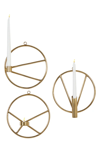 Made in India, these round wall sconces exude style and elegance. Each one has an 8” diameter and a candle holder. Arrange the scones together as a trio to occupy a large section of your wall. Or place each one in a different room to light up multiple spaces around your home. The gold-colored stainless-steel will complement other glam-style decor. Wall sconces candle holder can hold one candle on each. Set of 3 8" x 8" Items come with metal loops for easy and secure hang Suitable for indoor use only Stainless steel Imported