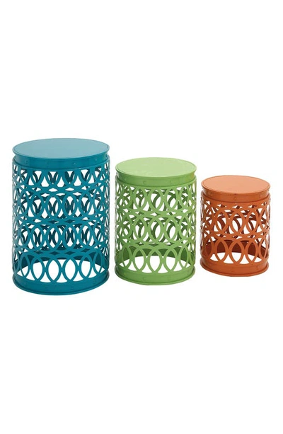 A set of three metal stools in bold colors are perfect for outdoor entertaining.Set includes:- Large: 32" height, 16" diameter- Medium: 18" height, 14" diameter- Small: 14" height, 12" diameter Set of 3 Metal Imported
