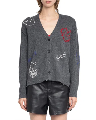 ZADIG & VOLTAIRE Mirkaz West Graph Embroidered Cashmere Cardigan In Gray