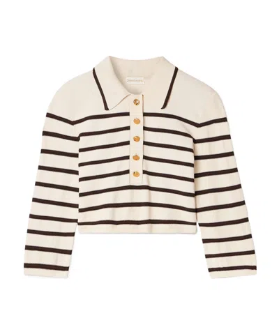 From the Aussie brand's spring '25 celebration of '70s surf culture, this cropped polo decorated with polished goldtone buttons channels nautical nostalgia buoyed by classic stripes. Titled 'Illumination,' this collection culls inspiration from the sun-drenched scenes of Alby Falzon's 1972 surf classic, 'Morning of the Earth,' the backdrop for the runway show. Button half placket Spread collar Elbow-length sleeves with ribbed cuffs 87% viscose, 12% polyamide, 1% elastane Dry clean Imported Designer Clothing